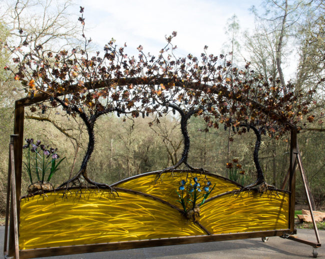 The Spirit Rider arch, sculpted from steel by artist Keith Peschel of Rock and Iron Design, is the final piece completing the Steve Larsen Memorial Archway at Davis Senior High School in Davis, California.